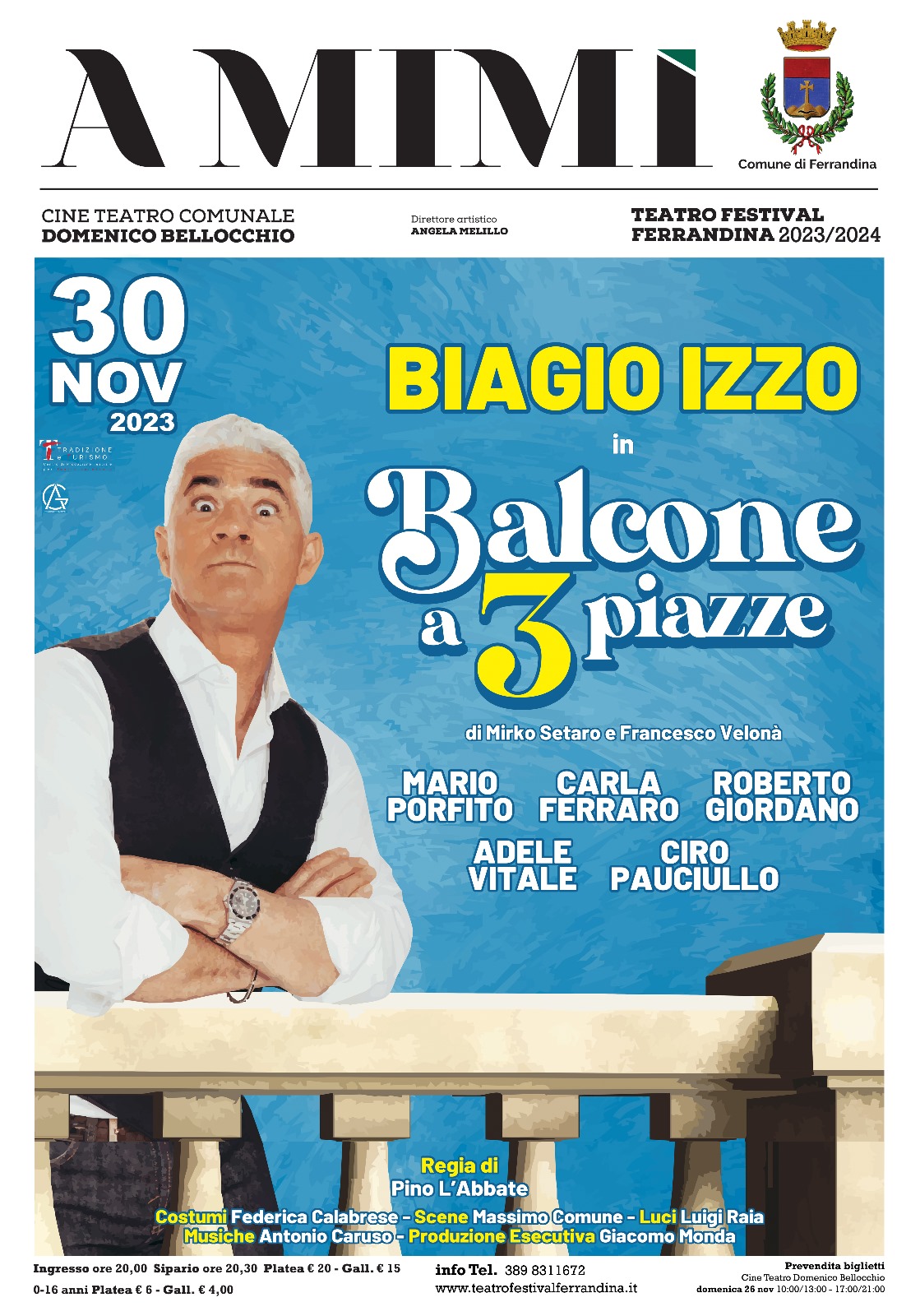 “Balcone a tre piazze”. La stagione di “A Mimì-Teatro Festival Ferrandina”, giovedì 30 novembre, al CineTeatro Bellocchio, prosegue con una commedia brillante.