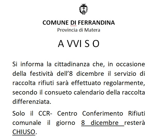 Si informa la cittadinanza che, in occasione della festività dell’8 dicembre il servizio di raccolta rifiuti sarà effettuato regolarmente, secondo il consueto calendario della raccolta differenziata.