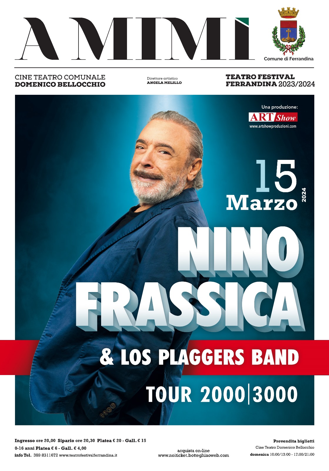 È già sold out la tappa del Tour 2000/3000 di Nino Frassica in programma venerdì 15 marzo, al CineTeatro Bellocchiom, nell’ambito della stagione di “A Mimì-Teatro Festival Ferrandina”. Nino Frassica è accompagnato dai Los Plaggers, band formata da sei formidabili musicisti; il nome Plaggers è una fusione tra Platters e plagio. Lo show è un originalissimo e coinvolgente viaggio musicale per oltre due ore di concerto-cabaret. Una grande festa, un’operazione di memoria musicale con un repertorio formato da oltre cento brani rivisti e corretti, in cui canzoni famosissime, pur mantenendo la propria identità, sono tagliate e ricucite alla maniera di Frassica. Verranno presentati brani come “Cacao Meravigliao”, “Grazie dei Fiori [...]