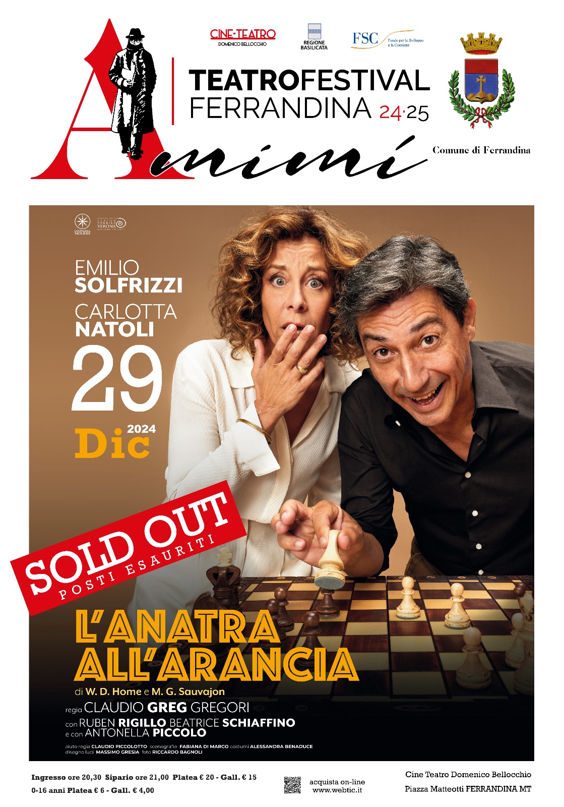 È già sold out “L’anatra all’arancia”, il prossimo appuntamento del Teatro Festival Ferrandina-A Mimì in programma domenica 29 dicembre 2024 al Cineteatro Bellocchio. Con Emilio Solfrizzi e Carlotta Natoli nei ruoli protagonisti, la commedia ci condurrà in un affascinante viaggio tra le pieghe dell'animo umano. Personaggi sofisticati e apparentemente distaccati si riveleranno, scena dopo scena, fragili e passionali, coinvolgendo gli spettatori in un vortice di emozioni. Sotto la sapiente regia di Claudio Greg Gregori, "L'Anatra all'arancia" è un'opera che va oltre la semplice comicità. Un testo brillante e ricco di sfumature, capace di far ridere e allo stesso tempo di invitare a una profonda riflessione sulla nostra natura. “L’Anatra all’arancia” [...]