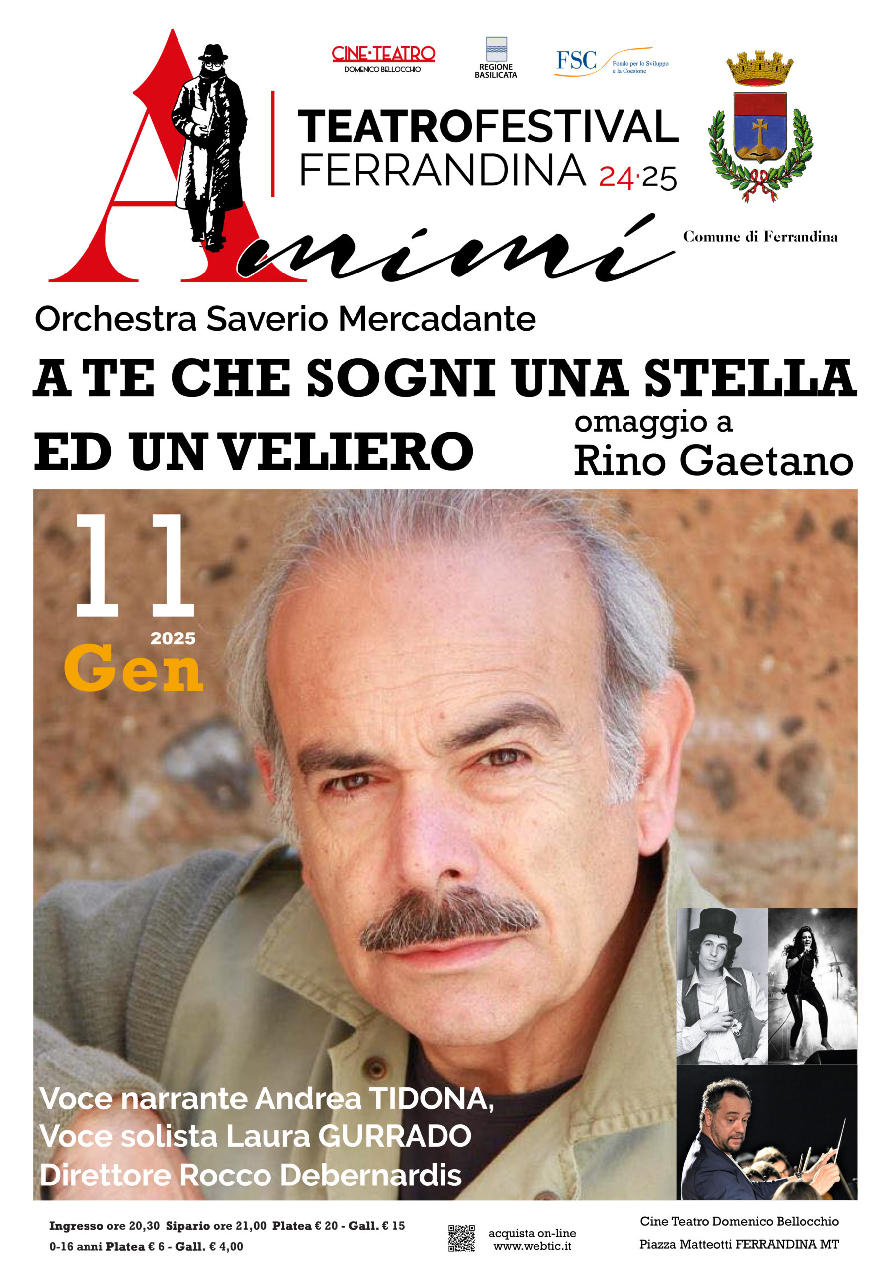 Sabato 11 gennaio 2025, la stagione del Teatro Festival Ferrandina- A Mimì, prosegue con uno spettacolo dedicato a Rino Gaetano, uno dei più grandi cantautori italiani di sempre. L’Orchestra Saverio Mercadante, diretta dal maestro Rocco Debernardis, riproporrà i brani più celebri dell’artista calabrese, riarrangiati con maestria dal compositore Rodolfo Saraco. "A te che sogni una stella ed un veliero" è il titolo dello spettacolo che vedrà la straordinaria voce solista di Laura Gurrado e la narrazione coinvolgente del noto attore Andrea Tidona, guidare il pubblico in un viaggio emozionante attraverso le canzoni più amate di Rino Gaetano. Rino Gaetano, noto per la sua ironia, la sua ribellione e il suo [...]