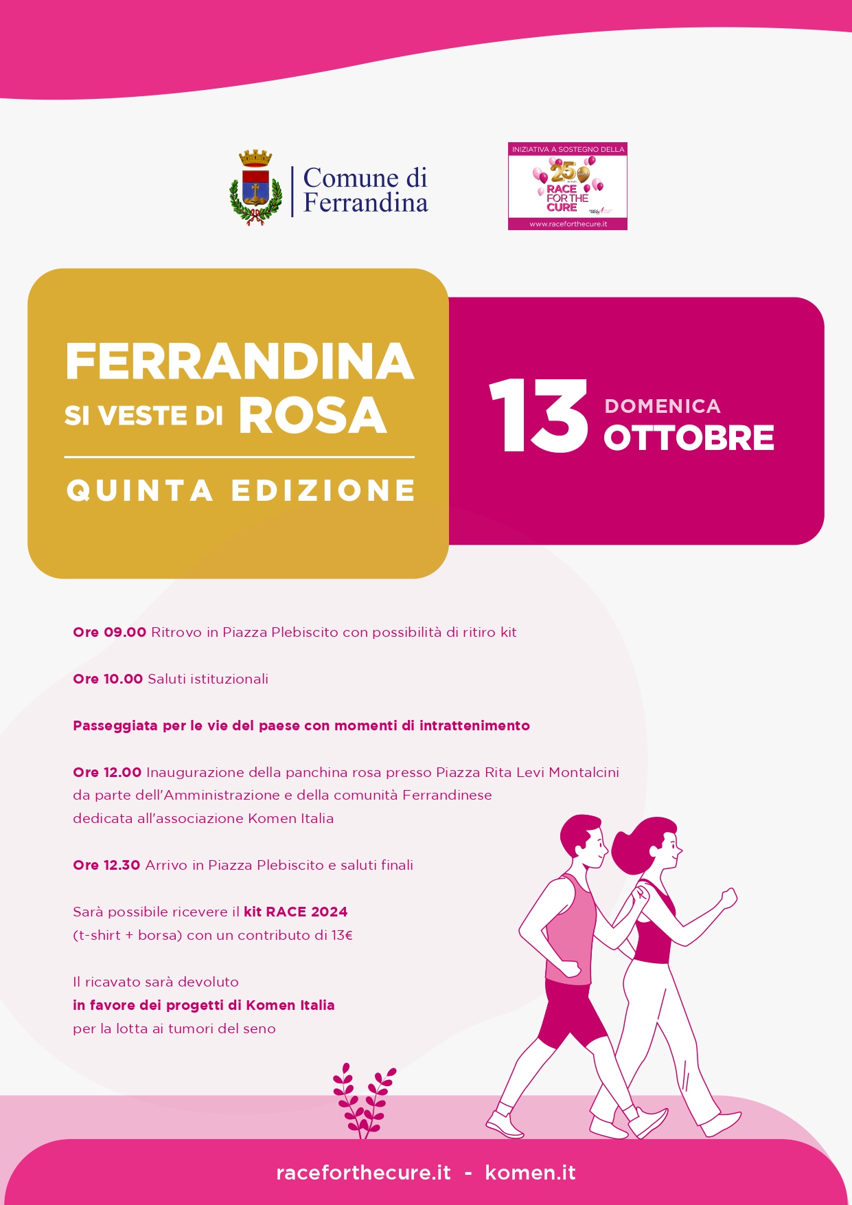 Domenica 13 ottobre 2024, la Città di Ferrandina si veste di rosa con la passeggiata a sostegno della lotta ai tumori al seno. L’Amministrazione comunale di Ferrandina ancora una volta a fianco dell’associazione Komen Italia per la sensibilizzazione e la promozione della diagnosi precoce dei tumori femminili. Passeggeremo lungo le vie cittadine indossando la maglietta di Race for the Cure 2024. Il punto di ritrovo è, alle ore 9,00 in Piazza Plebiscito. La passeggiata, dopo i saluti istituzionali, a partire dalle ore 10.30, si snoderà lungo le principali vie del centro storico con momenti di intrattenimento. Alle 12 sosta in piazzetta Rita Levi Montalcini per l’inaugurazione della panchina rosa dedicata [...]