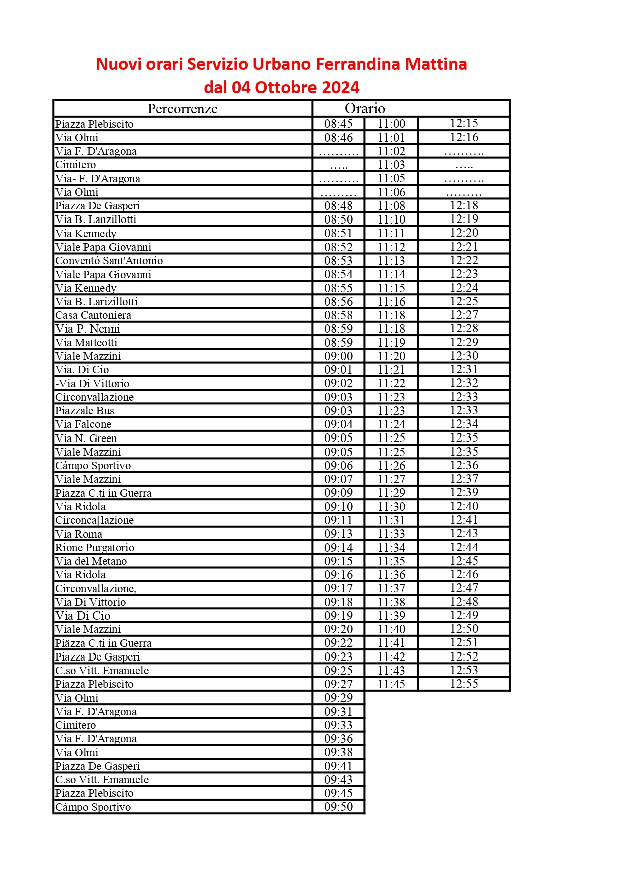 Si informa la cittadinanza che a partire da venerdì 4 ottobre 2024 il servizio di bus urbano effettuerà le corse della mattina (LINEA1) secondo il nuovo orario indicato nella tabella in allegato, con partenza da Piazza Plebiscito: alle ore 8.45-11.00-12.15. Gli orari delle linee pomeridiane 2 e 3 non subiranno variazioni. [...]