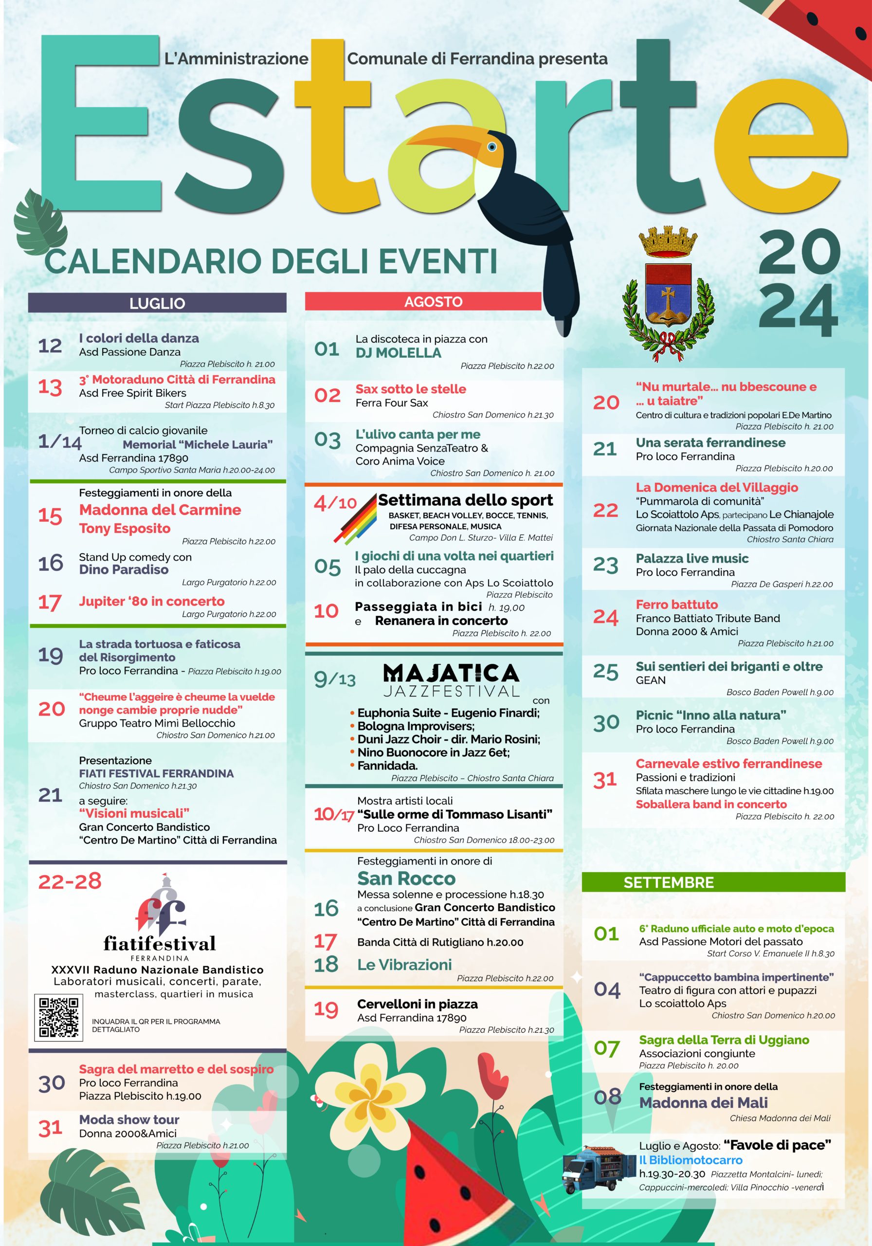 Ferrandina si prepara a vivere un'estate ricca di eventi, con un cartellone che spazia dalla musica al teatro, passando per lo sport e le attività a contatto con la natura. Dai concerti alle sagre, in programma appuntamenti per tutti i gusti e per tutte le età, che animeranno le piazze e i luoghi più suggestivi della città da luglio a fino a settembre. Tra i fiori all'occhiello dell'Estate 2024, il Fiati Festival Ferrandina, il Majatica Jazz Festival e la Settimana dello Sport , tutti riconosciuti come parte del patrimonio culturale intangibile della Regione Basilicata. Dal 22 al 28 luglio, il Chiostro San Domenico e Piazza Plebiscito saranno il palcoscenico di [...]