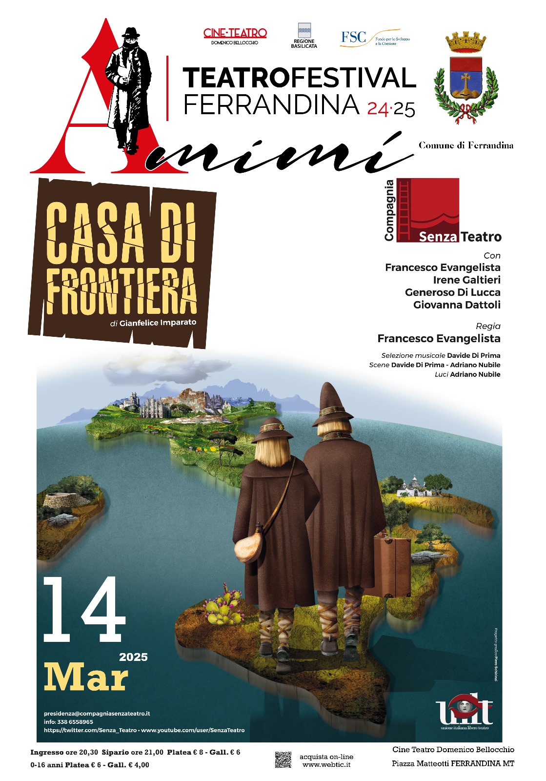 Venerdì 14 e sabato 15 marzo doppio appuntamento con la compagnia Senzateatro. La compagnia di Ferrandina presenta, nel cartellone serale e nella matinée riservata agli studenti degli Istituti superiori, la commedia di Gianfelice Imparato “Casa di frontiera”. La commedia, ruota intorno al personaggio di Gerardo Strummolo, un tornitore di Potenza che dopo l’avvenuta secessione tra Nord e Sud in un tempo indefinito, si trova come tutti i meridionali residenti nella Repubblica del Nord, ad essere rinchiuso in una delle “riserve” sparse per tutta la Padania, le “case di frontiera” C.R.I.C. “Centri raccolta identità culturale”. In questi luoghi, è vietato dare del “terrone” a qualcuno, piuttosto si usano termini come peninsulare, [...]