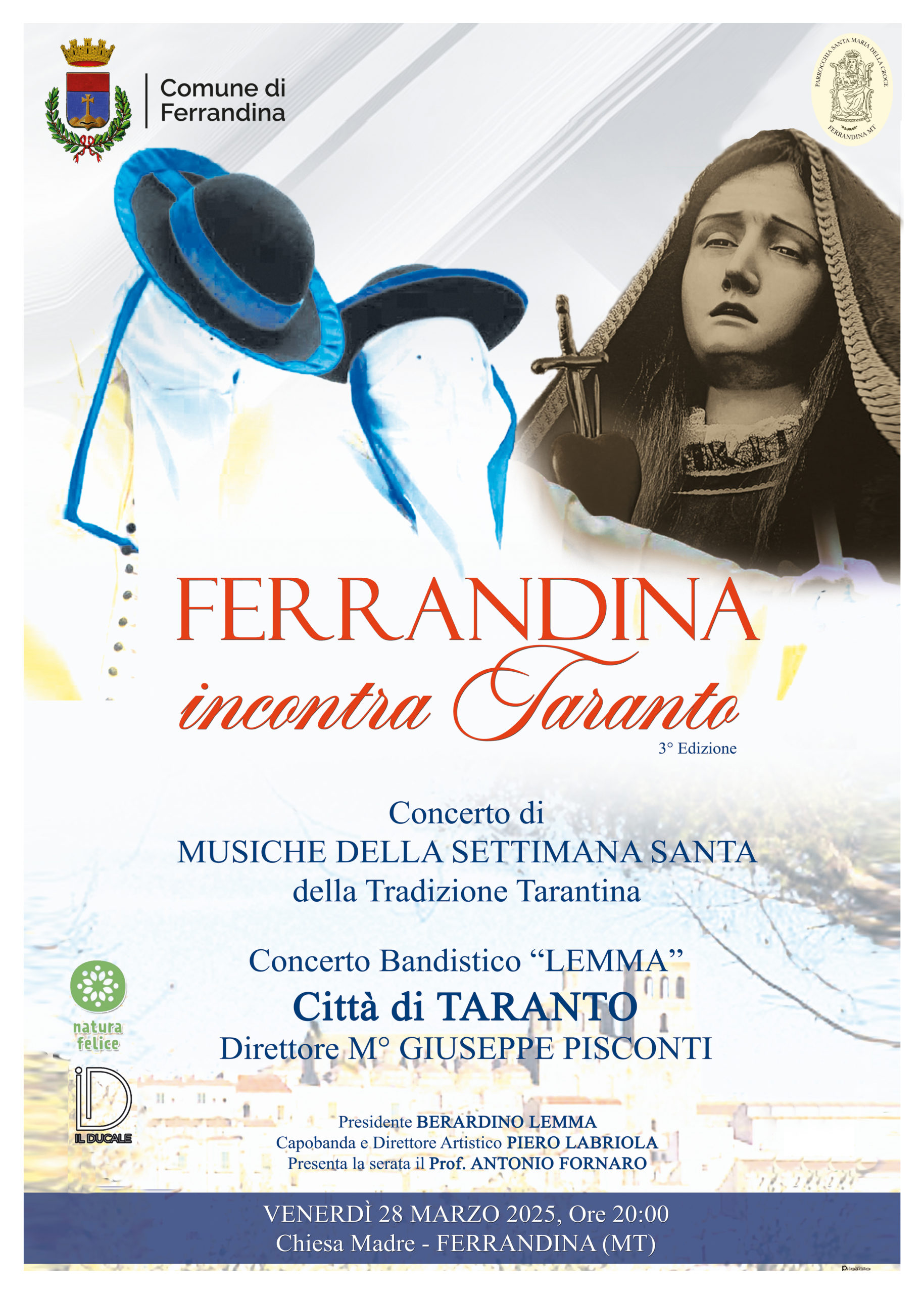 Venerdì 28 marzo, Ferrandina ospita un evento di grande significato religioso e culturale: la tradizionale Via Crucis, seguita dalla terza edizione del concerto "Ferrandina Incontra Taranto”. La giornata avrà inizio con la tradizionale Via Crucis, un momento di profonda devozione e riflessione che, partendo alle ore 17.30 dalla Chiesa di Santa Lucia si snoderà lungo il corso principale della città per concludersi in piazza Plebiscito. La processione vedrà la partecipazione delle Confraternite della SS. Addolorata e di San Domenico di Taranto, dell'Addolorata e del Carmine di Montescaglioso, del SS Crocifisso di Miglionico e delle Confraternite di Ferrandina, testimoniando un significativo scambio di tradizioni e spiritualità tra le comunità. A conclusione [...]