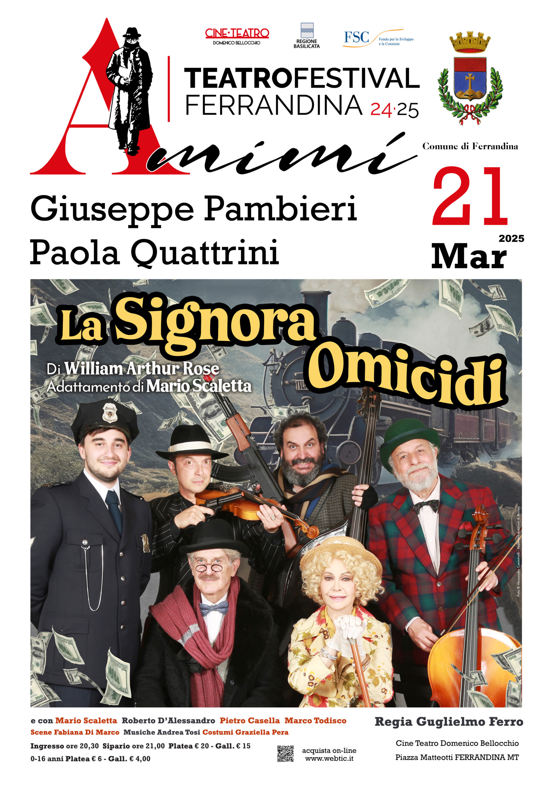 Venerdì 21 marzo, nell’ambito della stagione Teatro festival Ferrandina- A Mimì, Giuseppe Pambieri e Paola Quattrini portano in scena “La signora omicidi”. Dal celebre racconto di William A. Rose e ispirato all’omonimo film di Mackendrick, Mario Scaletta ha tratto l’adattamento teatrale de “La Signora Omicidi”. È una commedia ricca di humor e di divertenti intrighi, situazioni ambigue ed equivoci esilaranti, ambientata in una Londra anni Cinquanta, città che fa da sfondo all’improbabile incontro fra Louise Wilberforce, arzilla e svampita affittacamere, e il misterioso Professor Marcus, presunto musicista, in realtà capobanda di un gruppo di pericolosi malviventi che Louise Wilberforce finirà per smascherare. Nei panni della svampita e arzilla Signora Omicidi [...]