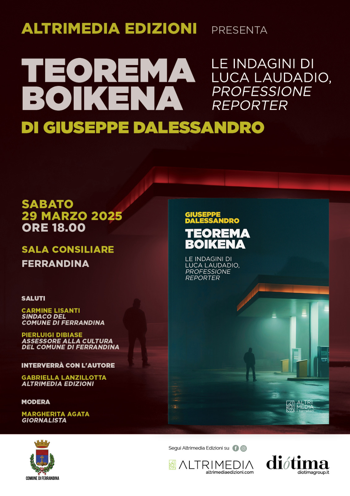 Sabato 29 marzo, nella sala consiliare del Comune di Ferrandina, alle ore 18, Giuseppe Dalessandro presenta il crime “Teorema Boikena. Le indagini di Luca Laudadio, professione reporter” (Altrimedia Edizioni). Interverranno: il sindaco di Ferrandina Carmine Lisanti, l’assessore alla Cultura Pierluigi Di Biase. Dialogherà con l’autore Giuseppe Dalessandro, la direttrice editoriale di Altrimedia edizioni Gabriella Lanzillotta, la giornalista Margherita Agata. In un intreccio brillante, sullo sfondo di un piccolo paese, il giornalista Luca Laudadio è alle prese con un omicidio che sconvolge la tranquilla routine. Schivo e a tratti burbero, nel privato affronta una relazione sentimentale complicata mentre sul lavoro è un professionista serio con una propensione particolare per i casi [...]
