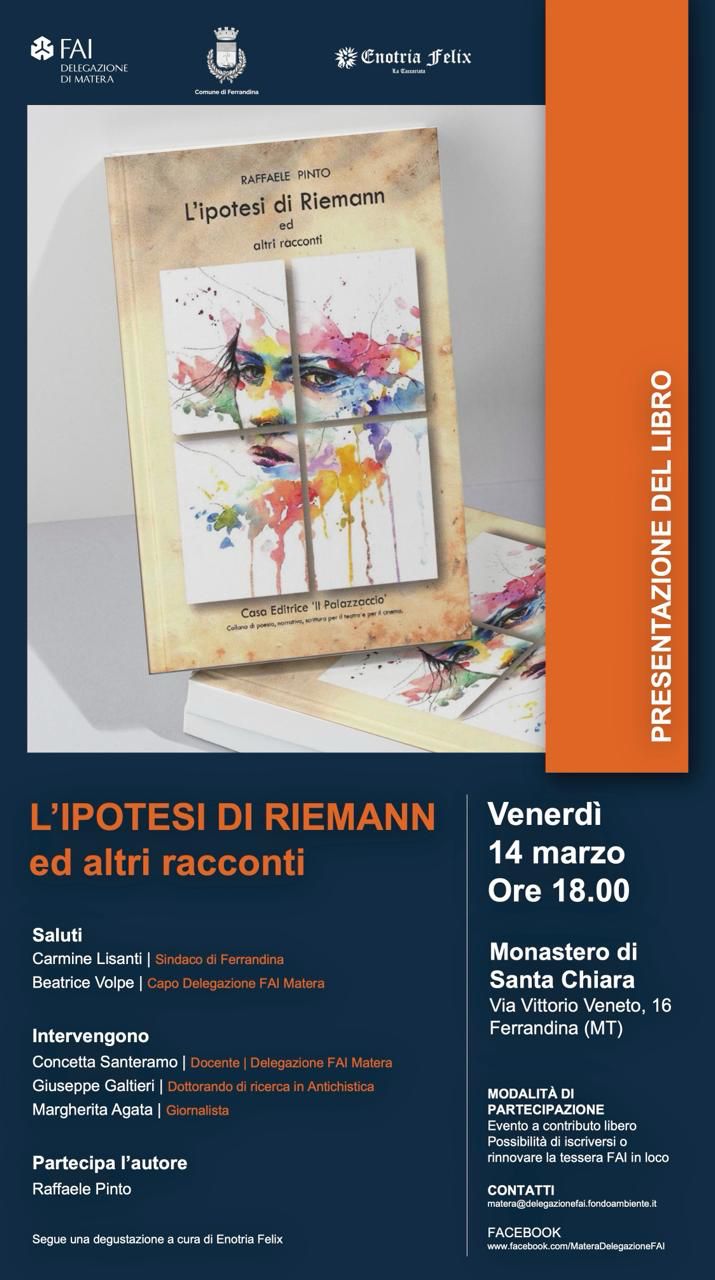 Venerdì 14 marzo, alle ore 18.00, nel Monastero di Santa Chiara, a Ferrandina, Raffaele Pinto presenta il libro “L'ipotesi di Riemann ed altri racconti” di Raffaele Pinto, edito da Il Palazzaccio. Un'opera che, in duecento pagine di scrittura piana e coinvolgente, esplora le storie di uomini, donne e bambini animati da curiosità e coraggio. Un viaggio intimo, attraverso un romanzo breve che fa respirare l'aria dei piccoli paesi, racconti classici che emozionano e un monologo sulla violenza di genere che fa riflettere. La serata, organizzata dal FAI di Matera in collaborazione con il Comune di Ferrandina, sarà un'occasione per dialogare con l'autore e per ascoltare le voci di chi ha [...]