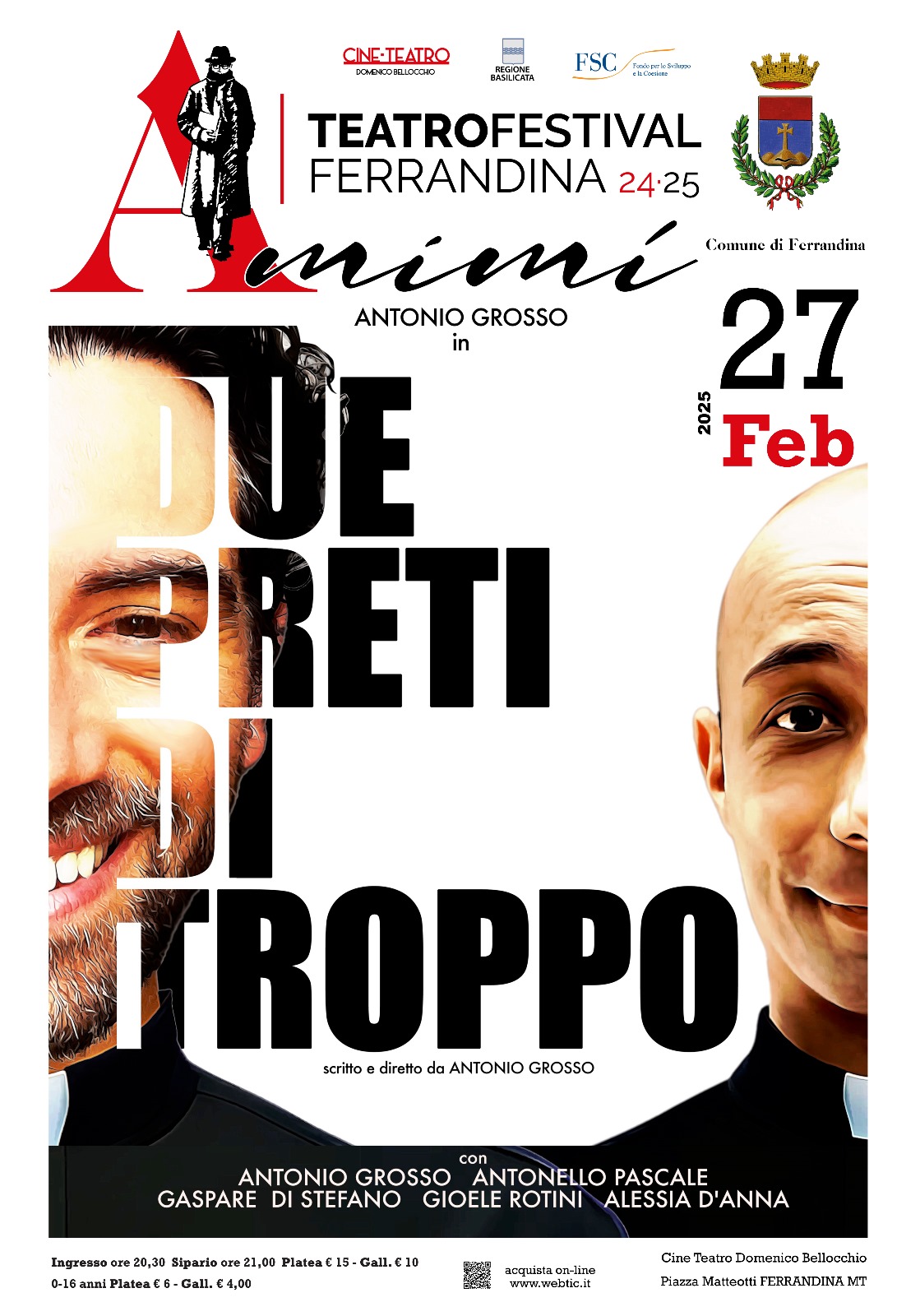 Giovedì 27 febbraio, nell'ambito della stagione "Teatro Festival Ferrandina- A Mimì", il Cineteatro Bellocchio di Ferrandina ospita lo spettacolo scritto e interpretato da Antonio Grosso “Due preti di troppo”. Una commedia brillante, dal retrogusto dolce-amaro, che ruota intono alla storia di Giggino, un ragazzo in cerca di guai, e di due preti mandati a risollevare le sorti di un tristissimo quartiere di cintura, regno della malavita e di organizzazioni criminali. Quando tutto sembra perduto, quando le cose sembrano andare in un' unica direzione, quando la vita sembra averti abbandonato, c'è sempre un momento, un attimo in cui all'improvviso arriva l'eroe...non è obbligatorio che abbia un mantello, un costume blu e [...]