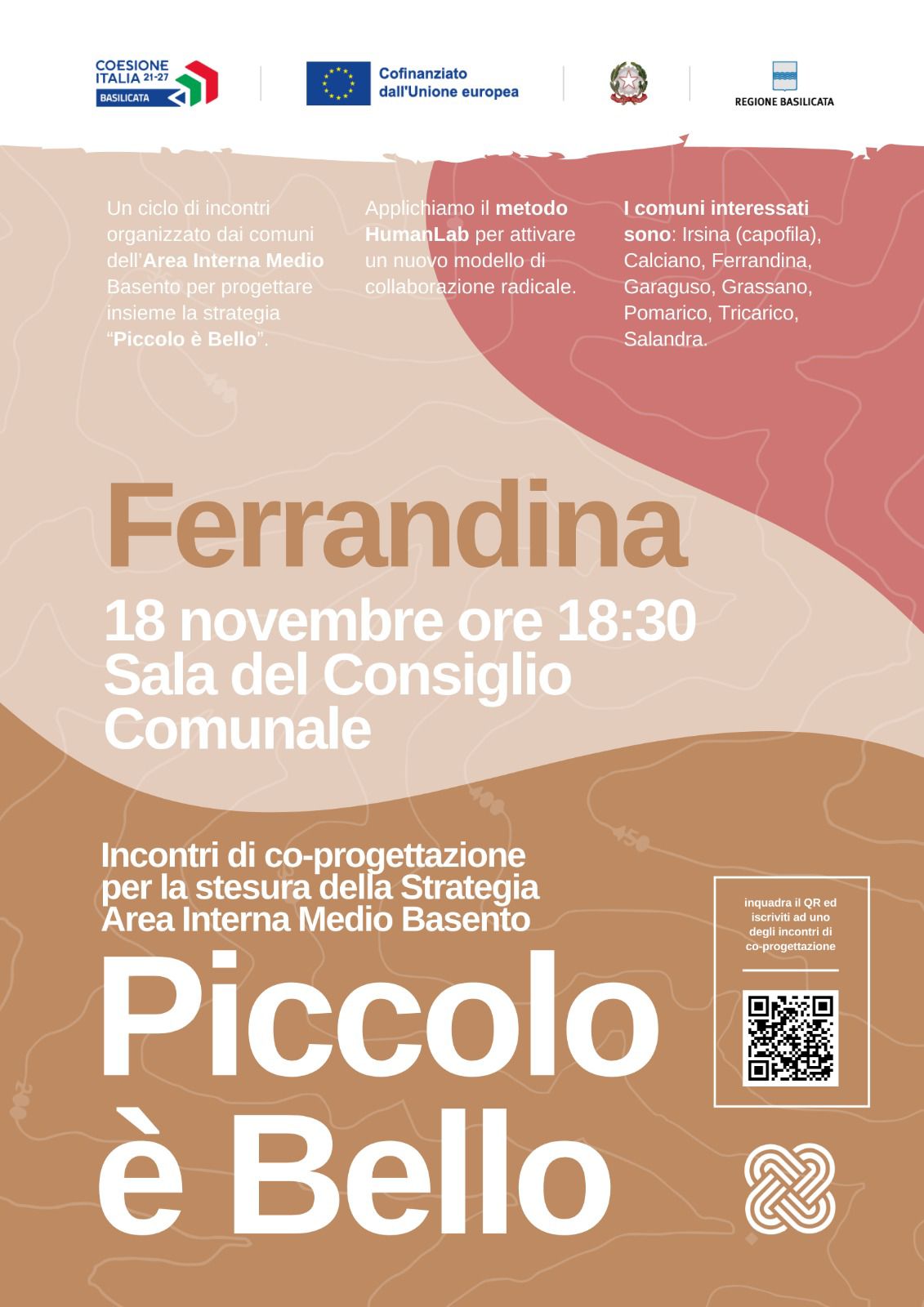 Parte da Ferrandina il progetto "Piccolo è bello". Il primo incontro, a cui parteciperanno i sindaci dell'area territoriale, le forze sociali e produttive, i rappresentanti tecnico-operativi della Regione Basilicata, in programma lunedì 18 novembre, alle 18:30 nella sala consiliare, segna l'inizio di un percorso partecipativo che coinvolgerà tutti gli attori del territorio per definire una strategia di sviluppo innovativa e sostenibile per il Medio Basento. La stesura della Strategia Area Interna Medio Basento coinvolgerà i comuni di Irsina (capofila), Calciano, Ferrandina, Garaguso, Grassano, Pomarico, Tricarico, Salandra. Obiettivo della strategia "Piccolo è bello” è costruire una filiera positiva e propositiva tra natura, cultura, tecnologia, patrimonio umano, per rivendicare una visione altruistica, [...]