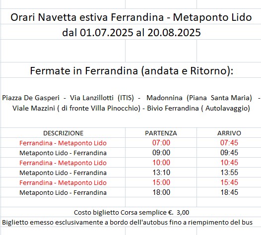 Si informa la cittadinanza che, a partire dal 1 luglio e fino al 20 agosto 2025, sarà attivo un servizio di trasporto con tre coppie di corse giornaliere, operative tutti i giorni, dal lunedì alla domenica, sulla tratta Ferrandina–Metaponto. 🚌 Il servizio è gestito da Autolinee Nolé. 💵 Il costo del biglietto per una corsa semplice è pari a 3 euro. 🎟️ I titoli di viaggio potranno essere acquistati direttamente a bordo dell’autobus. 📍 Fermate previste a Ferrandina: • Piazza De Gasperi • Via Lanzillotti (ITIS) • Madonnina – Piana Santa Maria • Viale Mazzini (di fronte Villa Pinocchio) • Bivio Ferrandina (in prossimità dell’autolavaggio). 🕒 Orari delle corse: Tratta [...]
