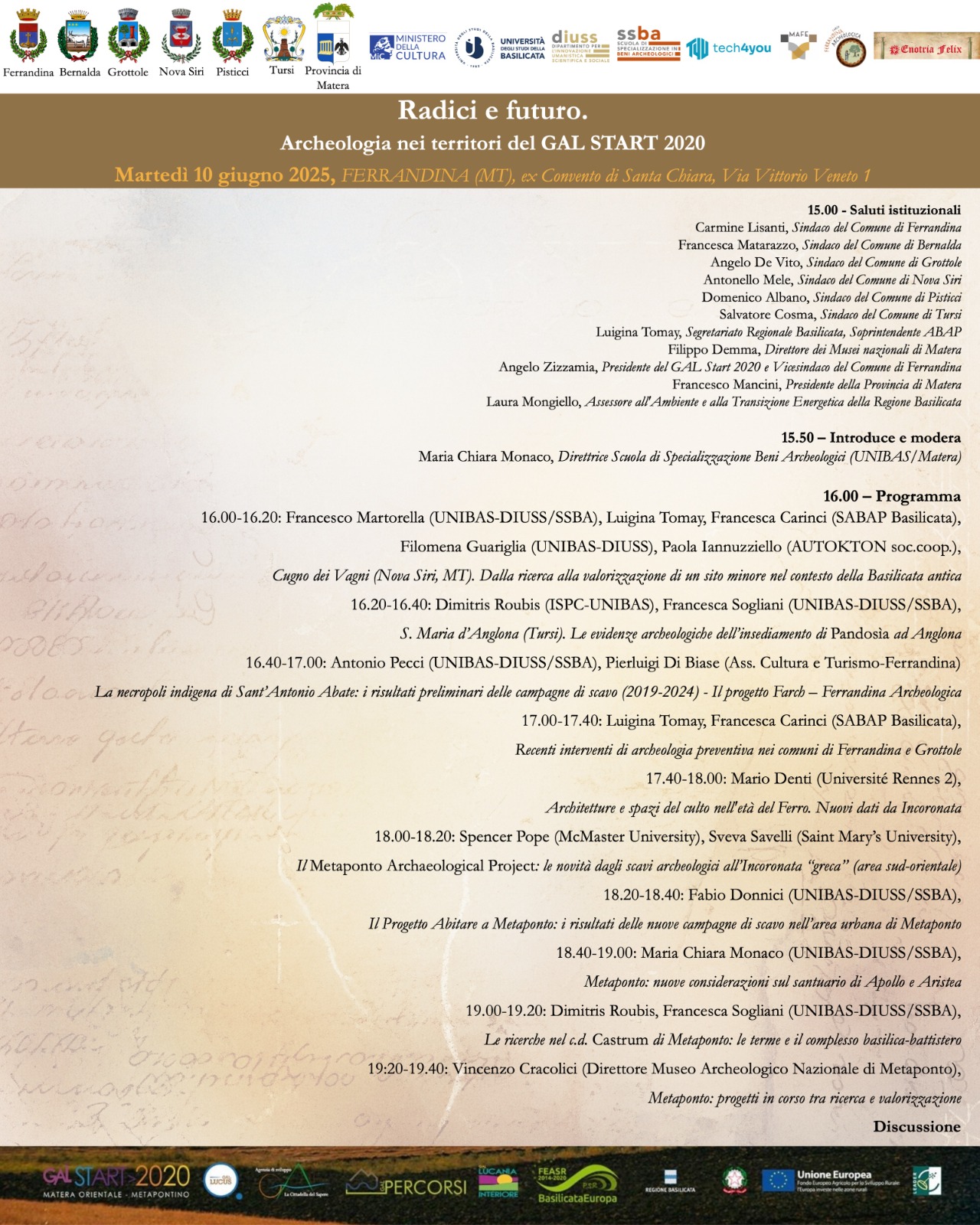 Un'intera giornata dedicata all’archeologia e alla valorizzazione dei territori lucani si svolgerà martedì 10 giugno 2025 a Ferrandina (MT), nella suggestiva cornice dell’ex Convento di Santa Chiara (Via Vittorio Veneto 1). L’evento, dal titolo "Radici e futuro. Archeologia nei territori del GAL START 2020", riunisce studiosi, istituzioni e amministratori locali per riflettere sul ricco patrimonio archeologico dell’area e sulle prospettive di ricerca e valorizzazione. A partire dalle ore 15:00, porteranno i saluti istituzionali i Sindaci dei Comuni coinvolti (Ferrandina, Bernalda, Grottole, Nova Siri, Pisticci, Tursi), rappresentanti della Regione Basilicata, della Provincia di Matera, della Soprintendenza Archeologia, Belle Arti e Paesaggio della Basilicata, dal Segretariato Regionale e dei Musei nazionali di [...]