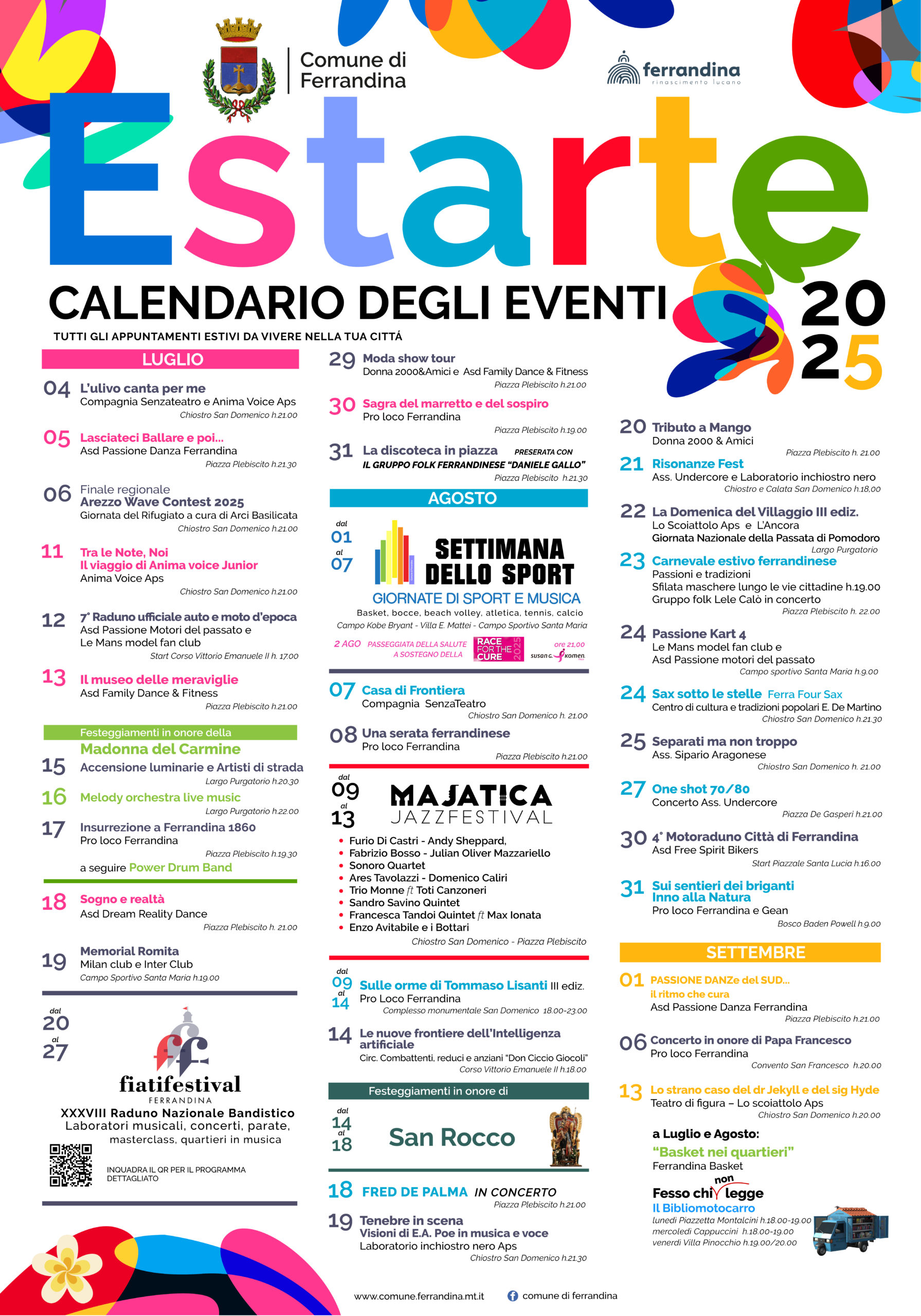 Ferrandina si prepara a vivere un’estate ricchissima di eventi che, da luglio a settembre, animeranno la città con spettacoli, concerti, danza, sport, tradizioni popolari e mostre. Con “Estarte 2025” la città è pronta a trasformarsi in un vero e proprio palcoscenico a cielo aperto. Eventi di punta dell'Estate 2025 il Fiati Festival Ferrandina, la Settimana dello Sport e il Majatica Jazz Festival, tutti riconosciuti patrimonio culturale intangibile della Regione Basilicata. Dal 20 al 27 luglio, il Chiostro San Domenico e Piazza Plebiscito saranno il cuore pulsante del Fiati Festival Ferrandina: una settimana interamente dedicata alla musica per fiati, un viaggio sonoro tra concerti, masterclass ed esibizioni che vedranno protagonisti artisti [...]