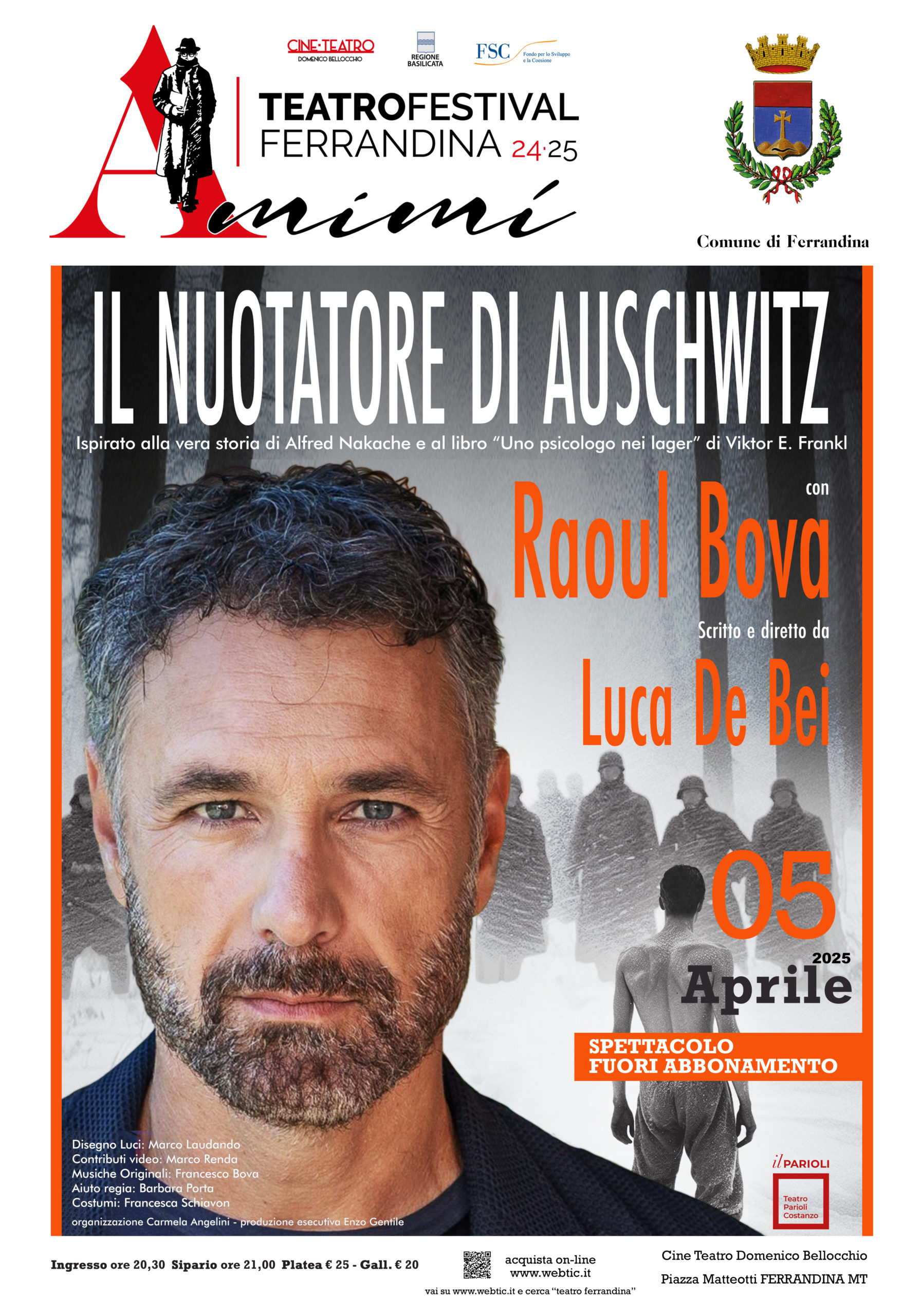 Il "Teatro Festival Ferrandina - A Mimì" presenta un evento speciale fuori programma: sabato 5 aprile andrà in scena "Il nuotatore di Auschwitz", interpretato da Raoul Bova. Lo spettacolo, adattato e diretto da Luca De Bei, è ispirato alla straordinaria storia vera di Alfred Nakache, nuotatore francese di origine ebraica e detentore di un record mondiale, e al libro "Uno psicologo nei lager" di Viktor E. Frankl. Nakache, deportato ad Auschwitz con il numero 172763, non si arrese all'orrore del campo di concentramento, continuando ad allenarsi nelle gelide acque di un bacino idrico. La sua forza e determinazione gli permisero di sopravvivere e, una volta libero, di tornare a gareggiare, [...]