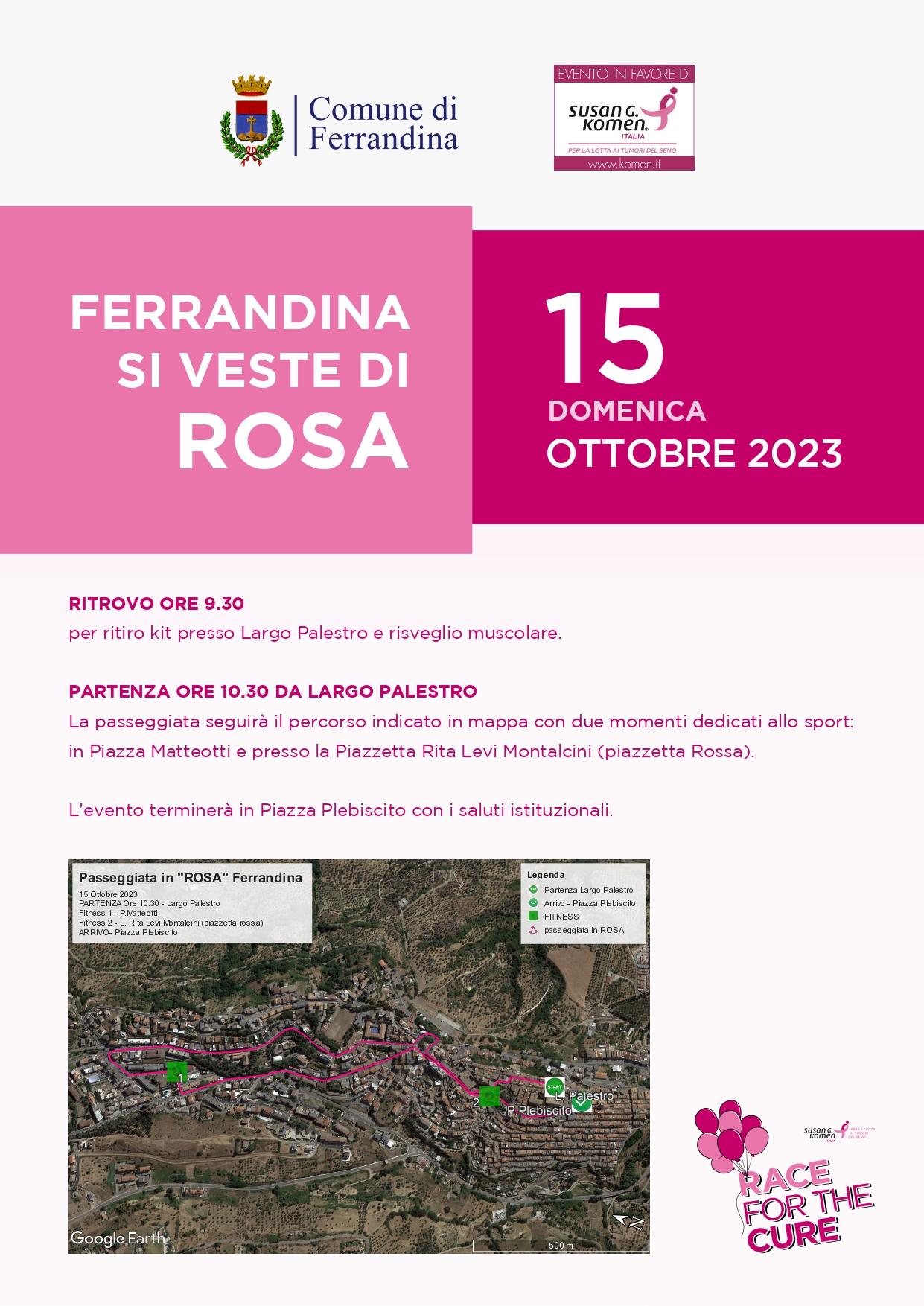 Dopo il grande evento della Race for the Cure a Matera, domenica 15 ottobre 2023, la Città di Ferrandina si veste di rosa con la passeggiata inclusiva a sostegno della lotta ai tumori al seno.